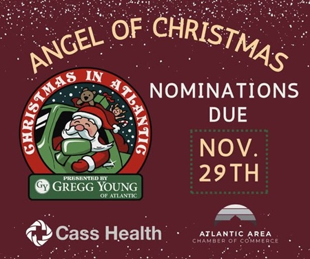 (Atlantic, IA) – The Atlantic Area Chamber of Commerce is now accepting nominations for the 2025 Angel(s) of Christmas, sponsored by Cass Health. The Angel of Christmas is a tradition in Atlantic, recognizing and thanking area residents and organizations who symbolize the true meaning of the season. Angels exemplify the true holiday spirit all year long, and put others first, spreading generosity and sharing the holiday spirit with everyone they meet.
