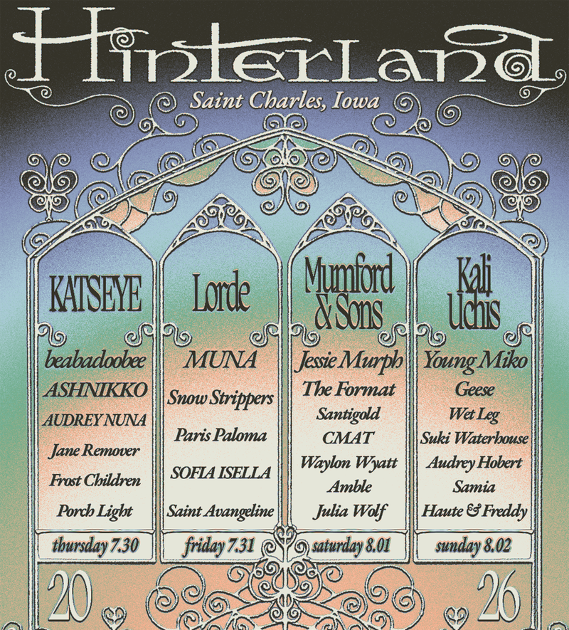 (Radio Iowa) – While many Iowans are thinking of Thanksgiving next week, others are making plans to see live music in the steamy summer of 2026. The acts are being announced for the popular Hinterland Music Festival that’s held in the southwest Iowa town of Saint Charles. A total of 29 acts are being released now, with more to come. The four headliners over the four-day fest are: KATSEYE, Lorde, Mumford & Sons, and Kali Uchis, with other acts including: Jessie Murph, Santigold, Geese, Wet Leg, and Minneapolis-based Porch Light.