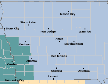 The counties in light blue will be under a Wind Chill Warning beginning at 6-a.m. Sunday. The counties in teal green will be under a Wind Chill Watch beginning Sunday afternoon. (Please see the specific warning and watch information posted under the Weather page on www.kjan.com., or go the National Weather Service website at www.crh.noaa.gov/dmx/)