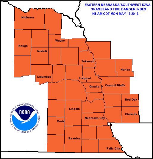 The National Weather Service in Valley, NE, says today’s Grassland Fire Danger Category in eastern Nebraska and southwest Iowa, is Very High.