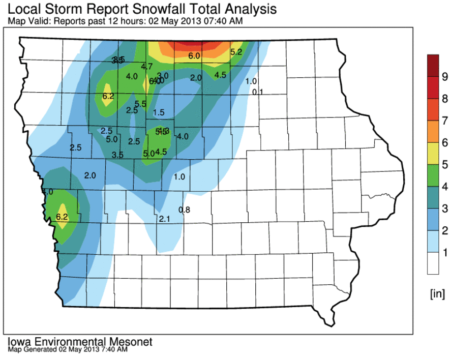 National Weather Service meteorologist Josh Boustead called the May storm “really, really unusual.” He says that in Omaha, for example, measurable snow has fallen only four times since 1884. The storm is moving east and is expected to lay a wet blanket on Des Moines later Thursday.