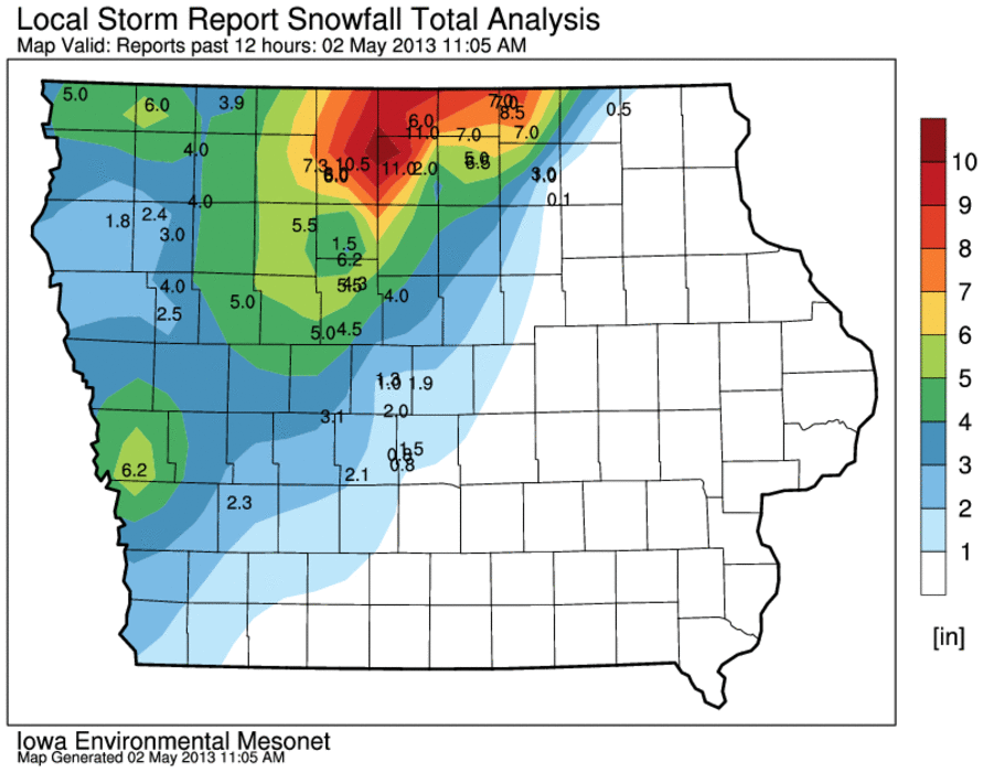 The snowstorm that hit the State overnight into early this (Thursday) morning, dumped up to nearly a foot of snow in northern Iowa. In Hancock County, 11-inches fell in the town of Britt, taking out tree branches. Near Whittemore, in Palo Alto County, 7.3-inches of heavy wet snow caused power lines and tree limbs to snap. Seven-inches of snow also fell in Emmet County, but there were no reports of damage.