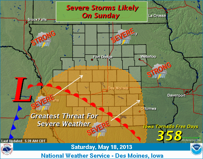 The greatest threat for severe weather arrives on Sunday as low pressure lifts into eastern Nebraska and west central Iowa. Severe storms are likely to occur across the state, especially during the afternoon and evening. A few storms may produce very large hail and tornadoes along with a damaging wind threat.