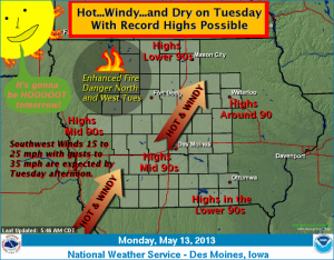 The warmest day is forecast on Tuesday where near record or record high temperatures are anticipated. Lower to middle 90s for highs will be common over central Iowa. Windy southwest winds and very dry relative humidity will lead to an enhanced fire danger over western and northern Iowa Tuesday afternoon. A cold front will sweep across the state Tuesday night and provide a slight chance of thunderstorms. Cooler temperatures are expected by Wednesday.
