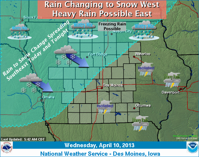 Thunderstorms will continue intermittently through tonight, especially across the east. Moderate to heavy rainfall is possible with thunderstorms and may lead to localized areas of ponding water and rises on local streams and rivers. A flash flood watch is in effect for eastern Iowa. Colder air will push south into the region throughout the day today, with rain gradually changing to snow. A wintry mix is likely across the northwest, with freezing rain also possible across the north overnight. Accumulating snow will be restricted to the north and west. Higher snowfall totals are possible north of Iowa, with light snow lingering into Thursday.