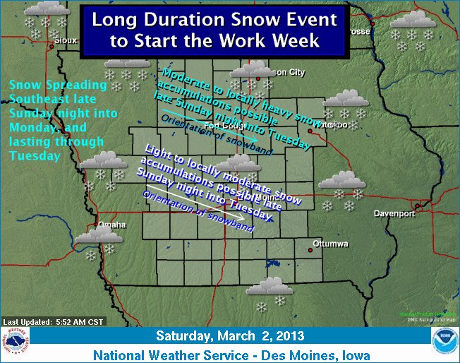 An upper level area of low pressure is forecast to push across the Northern Plains through the weekend and enter the Midwest by late Sunday night. The low will continue to track eastward throughout the day Monday and clear the area by Tuesday. Snow is forecast to develop late Sunday night in northwest Iowa and spread south and east during the day Monday. Snow is likely to continue, especially across northern Iowa Monday night into Tuesday. Moderate to locally heavy snowfall is possible across northern Iowa late Sunday night through Tuesday and lighter amounts are forecast further south. However, uncertainties still remain with the exact track of the low pressure and may lead to a significant change in the location of the heaviest snow. An upper level ridge of high pressure is expected to build into the Central U.S. by mid week and will provide a gradual warming trend beginning Thursday.