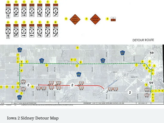 Iowa 2 will be closed to traffic on Monday, April 13 from .1 mile east of 342nd Avenue to the East Nishnabotna River. When this portion of the roadway is closed you will follow a marked detour route using U.S. 59 and Fremont County roads J-32 and L-68.