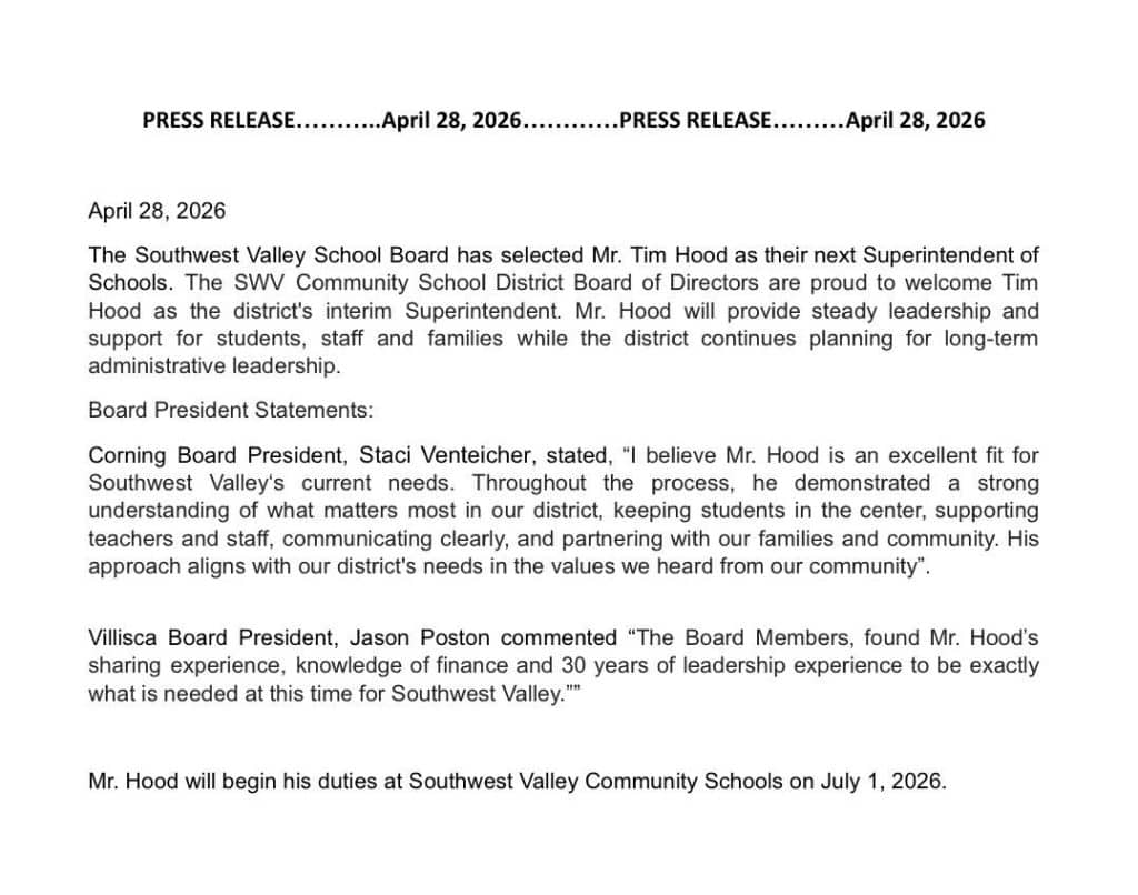 (Corning, IA) – The Southwest Valley Community School District, today (Tuesday), announced the District’s Board of Education has selected an interim Superintendent to lead the District. The announcement can be see below:
