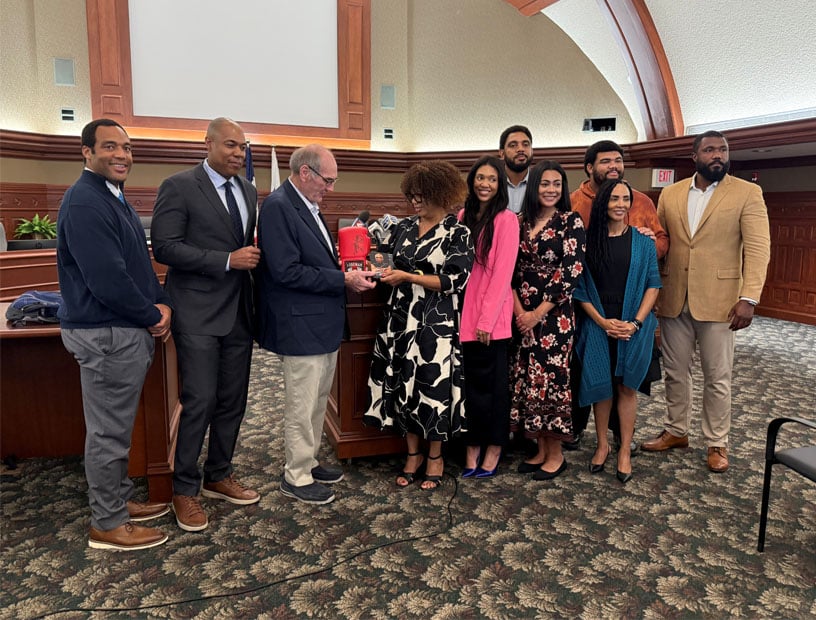 One of his sons, George Foreman the fourth, says his father brought happiness to everyone he met. Pictured: George Foreman’s children joined Sioux City’s Mayor to announce their father is buried there. (Photo by Sheila Brummer.)