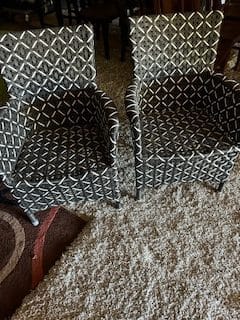 FOR SALE: Two black and white wicker chairs, like new, $25 each. Call 712-249-1994.