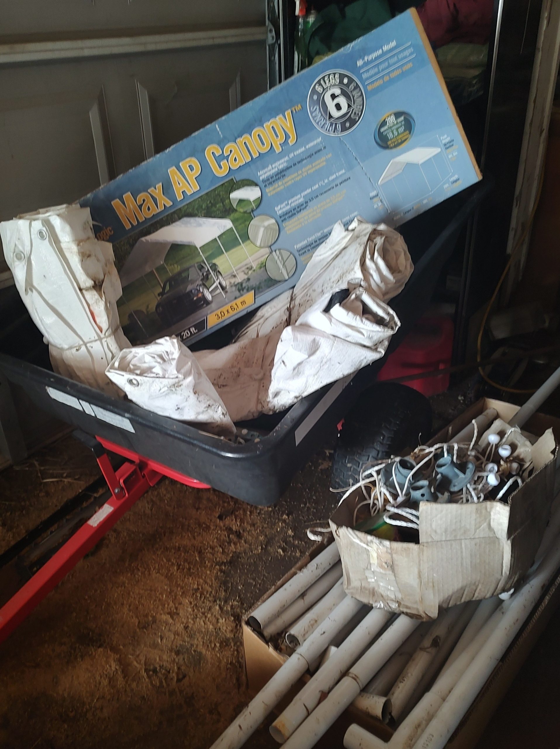FOR SALE: 10′ x 15′ x 8′ high canopy tarp four sides, poles, stakes, fasteners complete 2 years old. $175 OBO. 712-249-9258.