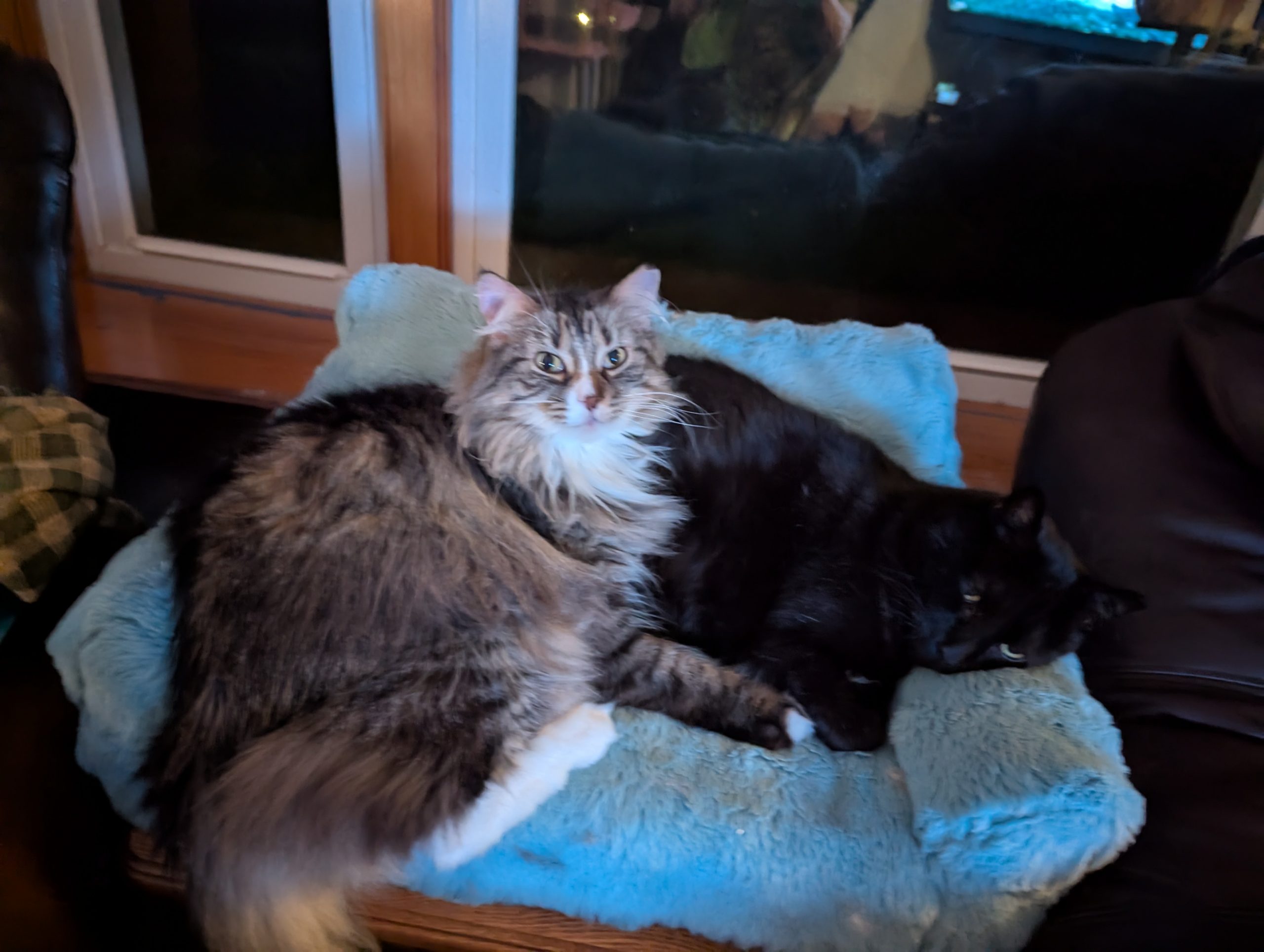 FREE TO A GOOD HOME: Need to re-home some cats. Chloe is the one laying with Midnight and Lucky in other pic. 531-530-9492. In Elk Horn.