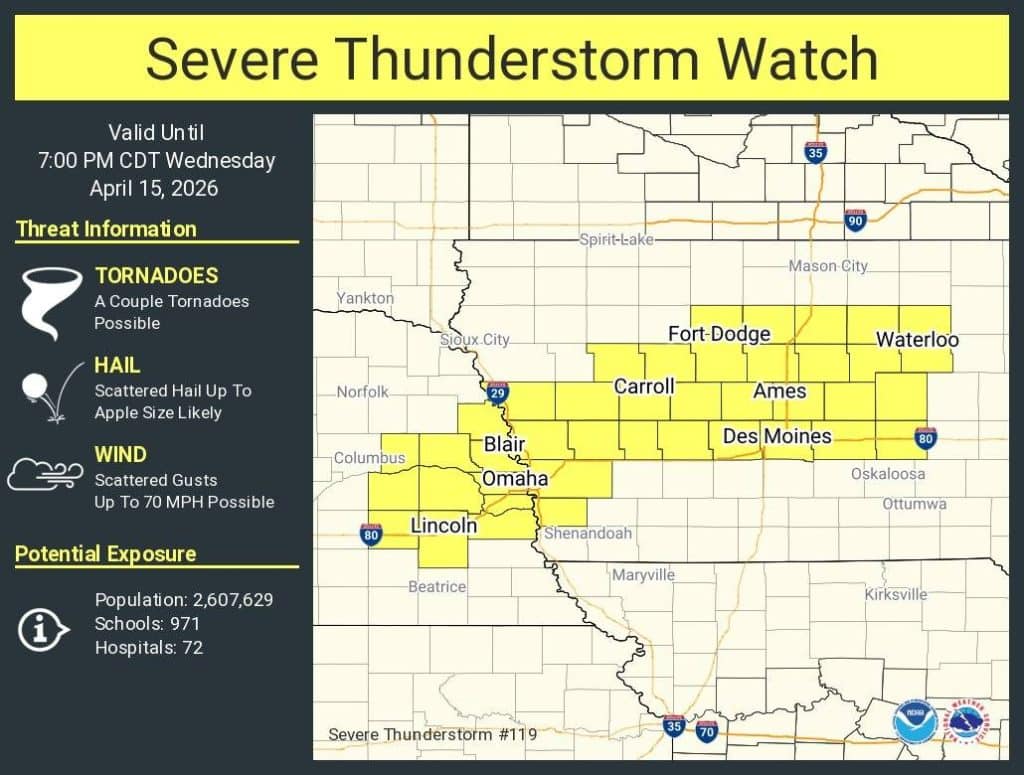 The NWS Storm Prediction Center has issued a Severe Thunderstorm Watch # 119 for portions of Western and Central Iowa, and Eastern Nebraska, effective this Wednesday afternoon and evening from 1230 PM until 700 PM CDT.