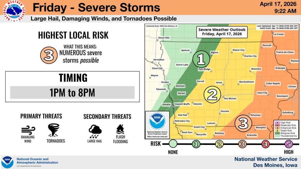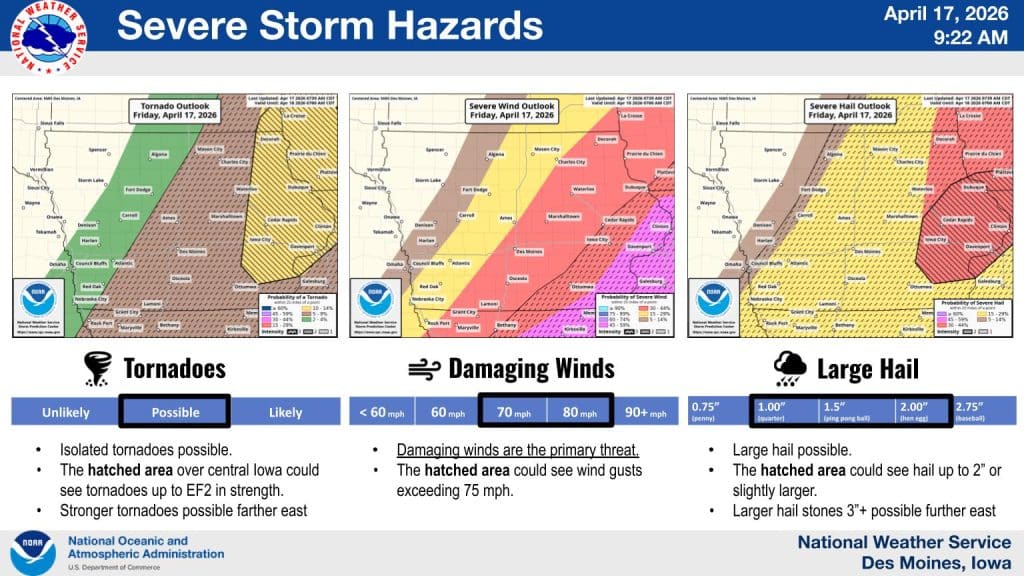 • Primary Hazards: Damaging winds, large hail, and a few tornadoes are possible.